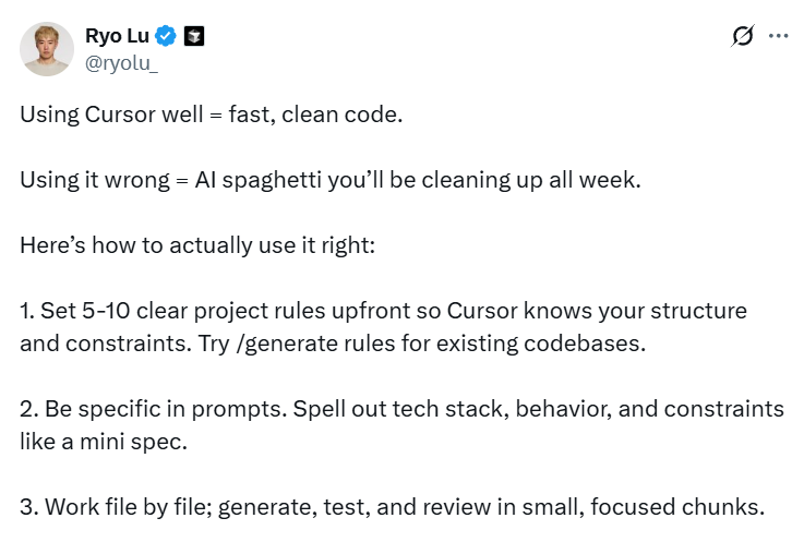 A couple of weeks ago, Ryo Lu, Cursor’s Head of Design, wrote a thread about the potential downsides of using Cursor to write code. In it, he listed 12 steps to take if you don’t want to end up with AI spaghetti you’ll be cleaning up all week.