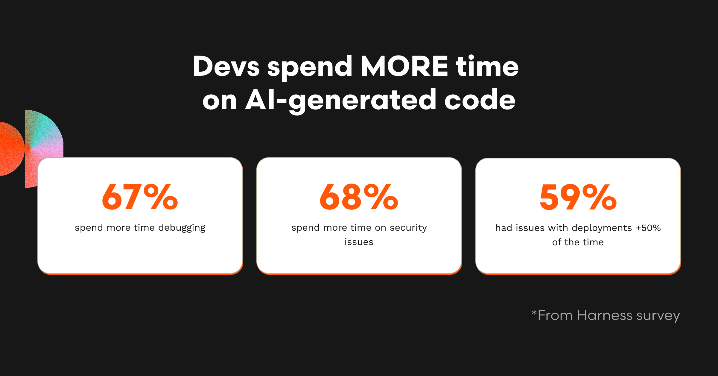 Developer forums and surveys consistently highlight frustration at AI-generated code's tendency to introduce more bugs and vulnerabilities with one survey estimating that AI coding tools add up to 41% more bugs. For example, Harness recently released a survey that revealed 67% of developers spend more time debugging AI-generated code than human-generated code and 68% spend more time resolving security issues. Even worse was that 59% in the Harness survey said that they experienced problems with deployments at least half the time they used AI coding tools.