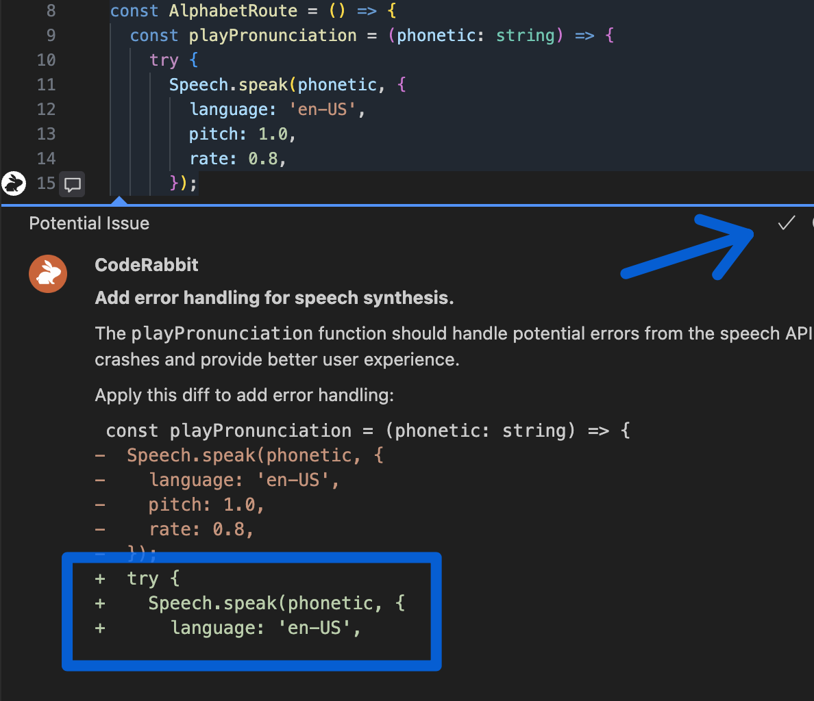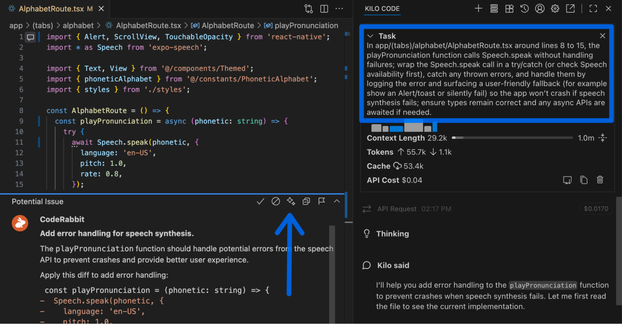 For more advanced cases that can’t be resolved with a simple fix, CodeRabbit IDE extension writes a prompt that it sends to an AI agent of your choice. Fun fact: CodeRabbit is so good in writing prompts so I got a lot to learn from, improving my Prompt Engineering skills!