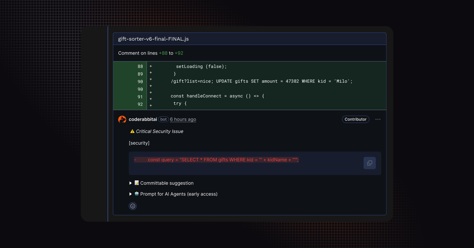 CodeRabbit immediately flagged the elves’ SQL string concatenation with warnings like: