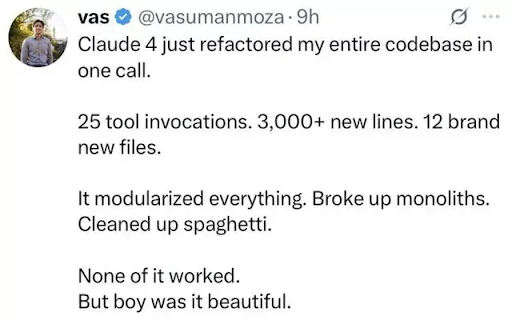 Suddenly, you're in a codebase that works but can't be touched without summoning six hours of debugging, a million tokens-long context window, and three therapy sessions.