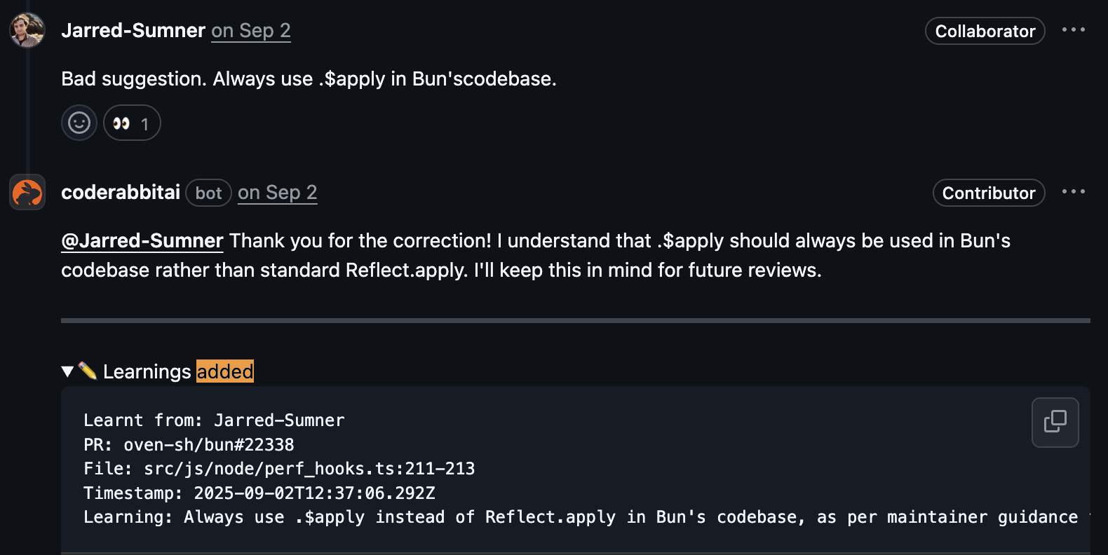 Every time an engineer corrects CodeRabbit, clarifies a team convention, or explains why something doesn’t fit their stack, that explanation is stored as a natural language instruction. We don’t just remember that the comment was rejected, we remember why.