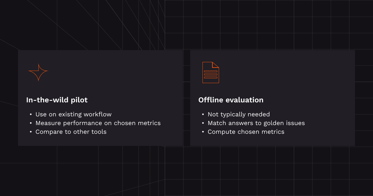 The most reliable evaluation of any tool involves a real-world pilot over a controlled offline benchmark. This allows you to see how it works in day-to-day situations versus just evaluating a tool based on criteria defined by a third party vendor.